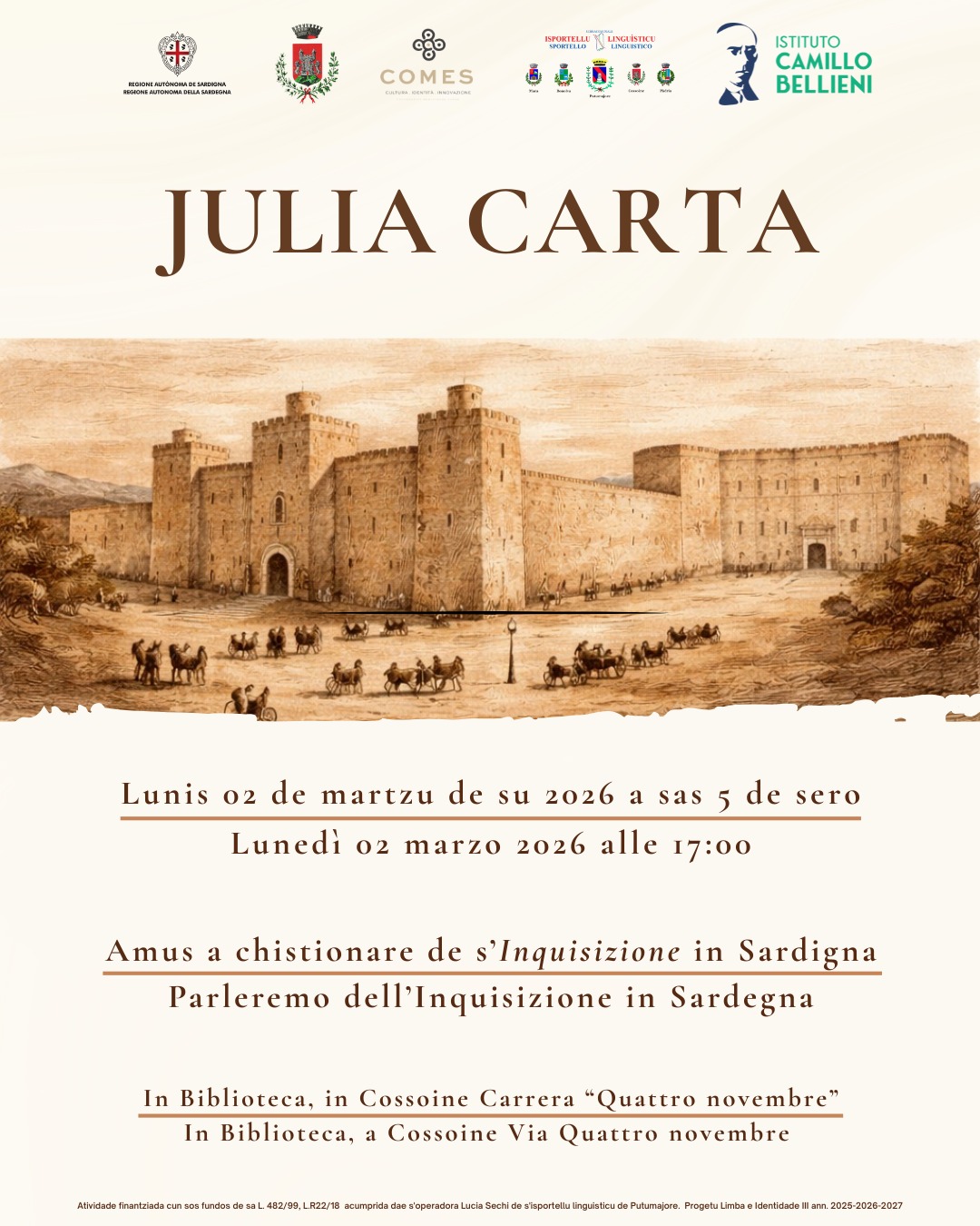Lunis 2 Martzu a sas 5 de sero, amus a chistionare de s'inquisizione in Sardigna e de Julia Carta, in sa Biblioteca in Cossoine.